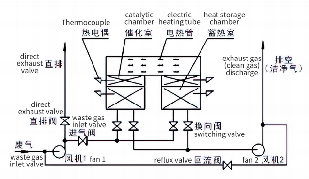 廃棄ガス処理のプロセスを開始する前に、炉の暖房室と熱貯蔵ベッドが予熱されています。予熱した後、廃ガス源は機器に接続されます。一致するファンの作用の下で、有機廃棄物ガスは最初に予熱した熱貯蔵セラミックボディ1との熱交換を受け、温度上昇後に加熱ゾーンに入り、次に廃棄ガスの温度が触媒反応に必要な温度に達するまで加熱ゾーンの2番目の温度上昇を受け取ります。廃棄ガスは触媒室に入り、反応し、二酸化炭素と水を生成し、熱エネルギーを放出します。処理されたクリーンガスは、熱貯蔵セラミックボディ2で熱貯蔵を受け、ファンによって排出されます。排気ファン用の入口熱電対で温度検出を通じて温度を検出した後、バルブが切り替えられ、廃棄ガスが熱貯蔵セラミックボディ2に入ります。