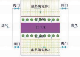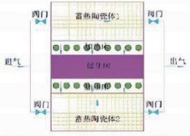 2番目のチャンバー | きれいなガス排出 熱貯蔵セラミックボディ2は熱を吸収します | 排気ガスによる熱吸収 発熱熱貯蔵セラミックボディ2 |