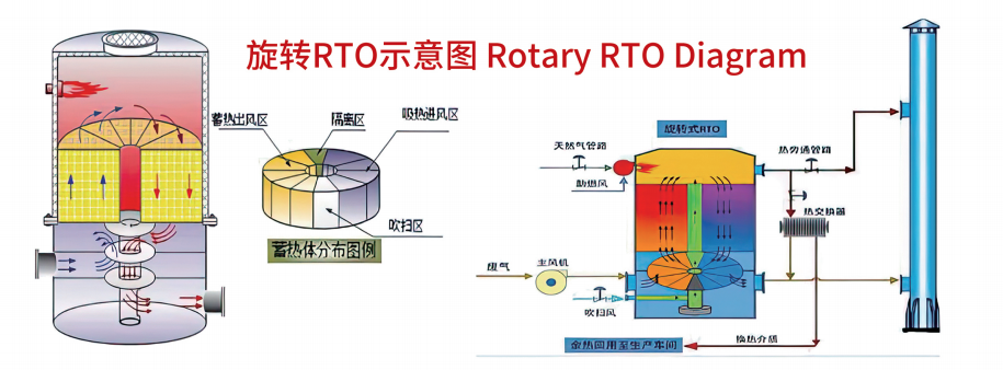 ロータリーRT0は、主に燃焼室、セラミックパッキングベッド、ロータリーバルブなどで構成されています。炉の本体は、12個のセラミックパッキングベッド、5個のインレットチャンバー(予熱ゾーン)、5個の出口チャンバー(冷却ゾーン)、1個のパージチャンバー、1個の隔離チャンバーに分割されます。廃棄ガスは、吸気ディストリビューターを介して予熱ゾーンに入り、特定の温度に予熱された後、完全な酸化と分解のために上部燃焼室に入ります。精製された高温ガスは、燃焼室を離れ、冷却ゾーンに入り、セラミックエネルギー貯蔵材料に熱を伝達し、ガスを冷却してガス販売業者から追放します。冷却ゾーンのセラミックエネルギー貯蔵材料は、熱を吸収し、次のサイクルで排気ガスを加熱するための大量のエネルギーを貯蔵します。このようにして、廃棄ガスは交互に酸化され、燃焼室で分解されます。排気ガスのVOC濃度が特定の値を上回り、酸化的分解から放出される熱が燃焼室の反応温度を維持するのに十分である場合、燃料を使用してそれを加熱する必要はないため、エネルギーサイクリングの利用を改善する必要はありません。